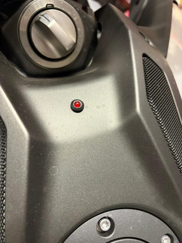 The Defcom 3 system includes a small red LED that is fitted to the bike to show the status of the alarm. When the system is armed, the LED flashes to show that the alarm is active and the bike is protected. This also acts as a visible deterrent, as it makes it clear the bike has a live security system fitted. When the alarm is disarmed, the LED turns off, so you can quickly see whether the system is on or off.